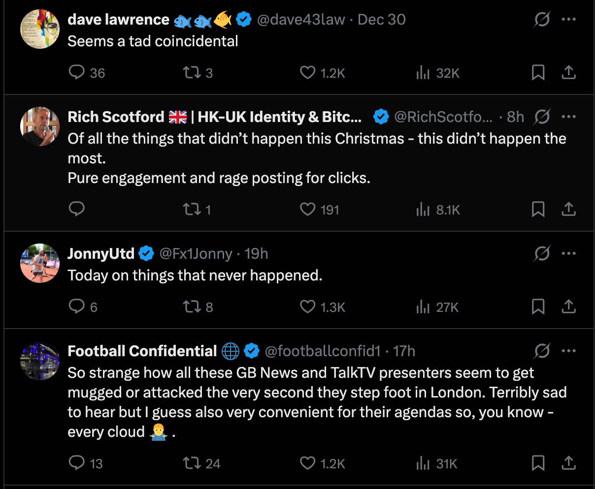 When I posted about my bag snatch yesterday, ordinary folk immediately rushed to console me, and chastise our failing system. But a significant hoard of phlegm specked leftists turned on me, demanding crime reference numbers, denigrating me as a known liar and lunatic, attacking from the sidelines. Including once respected journalists. A woman who has just been robbed, being attacked for mentioning it. I didn't even say the word ‘migrant’. The moral inversion is breathtaking to behold.