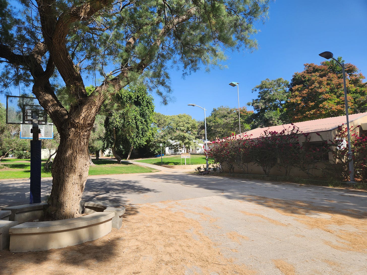 It's a bright, sunny day. The fragrance of blooms catches the nose amidst the dust and the heat. A light breeze rustles the leaves of the many trees dotting the compound.