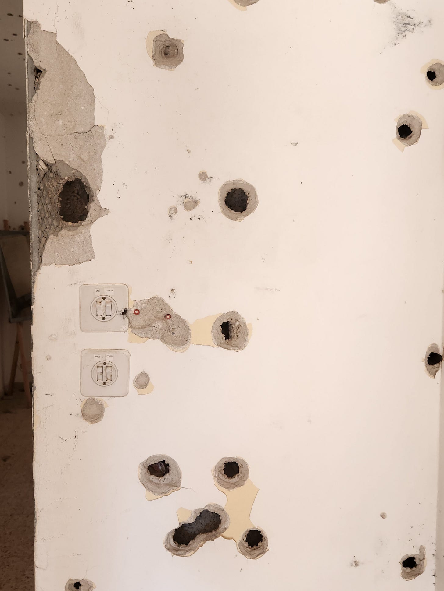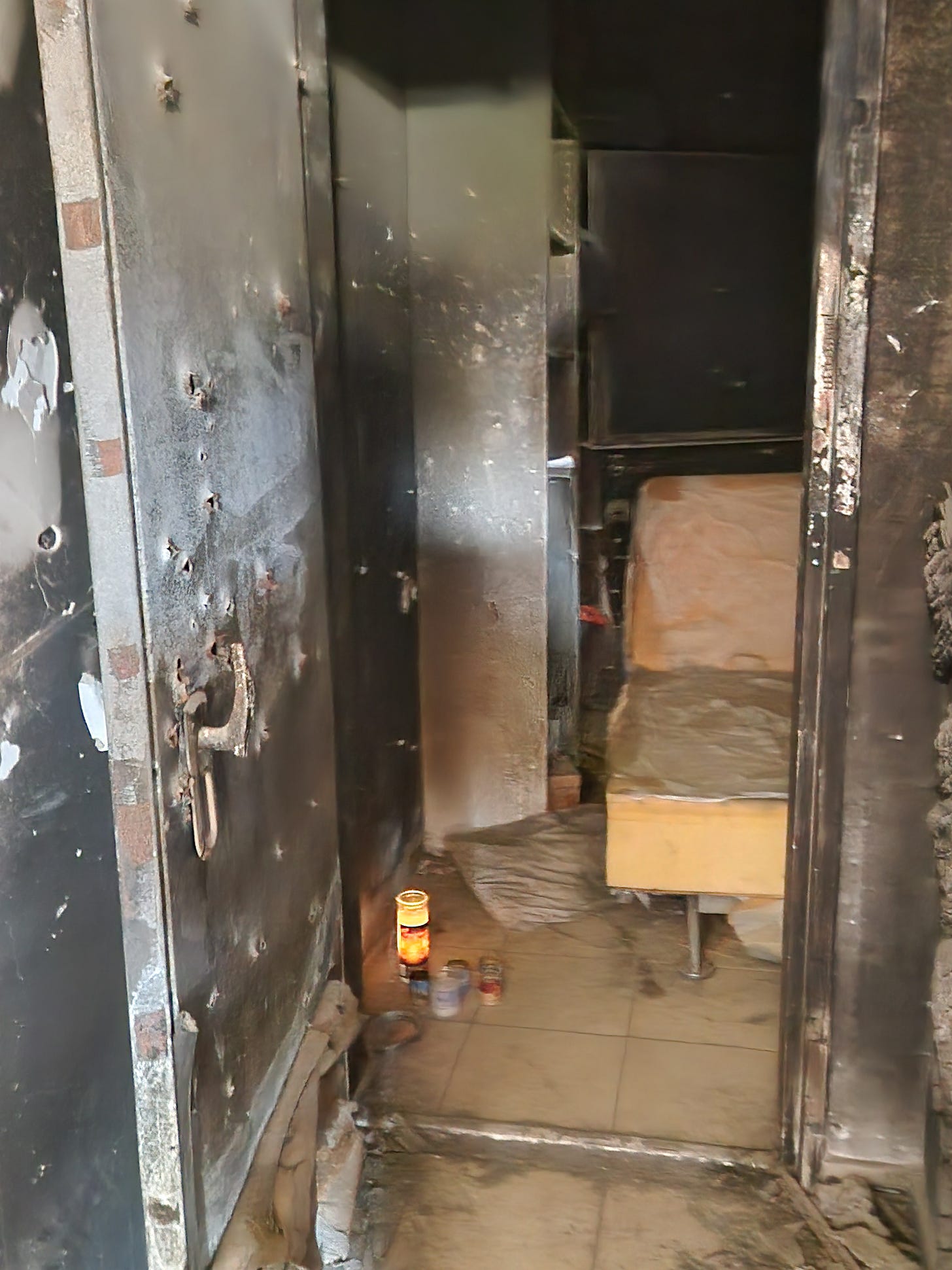 A tiny, humble frame of a small house, burnt and battered, in the young person's neighbourhood, where her cousin Nitzan had valiantly tried to stay in his safe room, clinging onto the handle and pulling the door inwards as the terrorists fought to gain access, repeatedly shooting up the door.