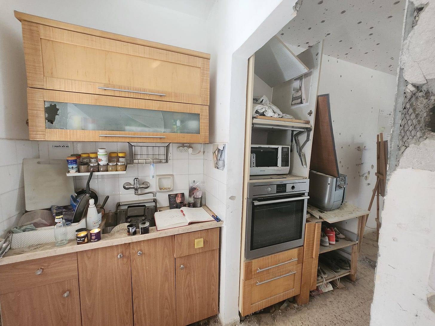 The safe rooms are not designed to lock from the inside. They were designed to protect from rocket fire from above, not a ground invasion, with doors purposefully not locking in case first responders and rescuers needed to get inside. For eight hours he struggled, having been shot in the leg and managing to make a tourniquet with one hand while using the other to hold the door firm as bullets continued to rain down.